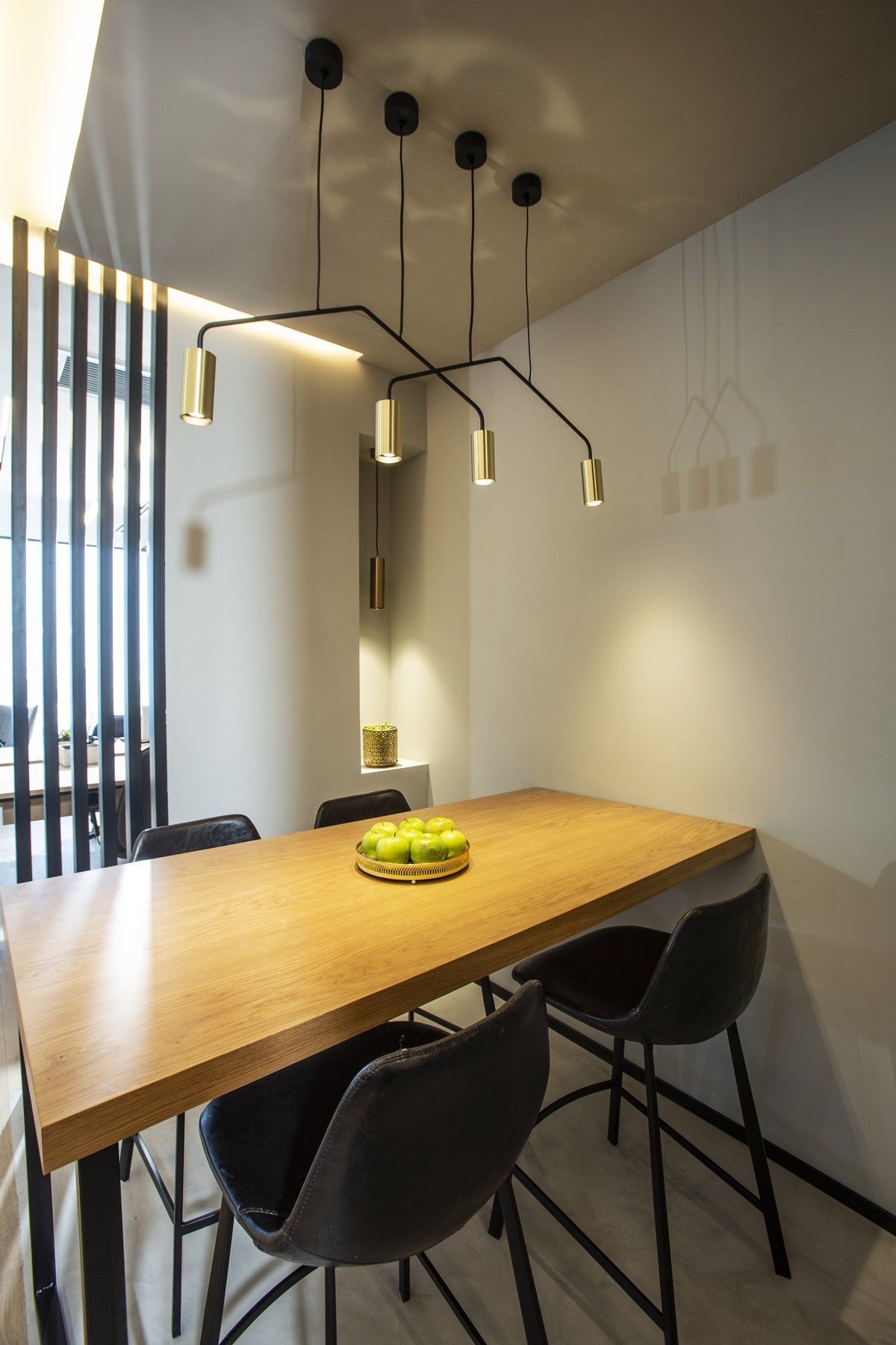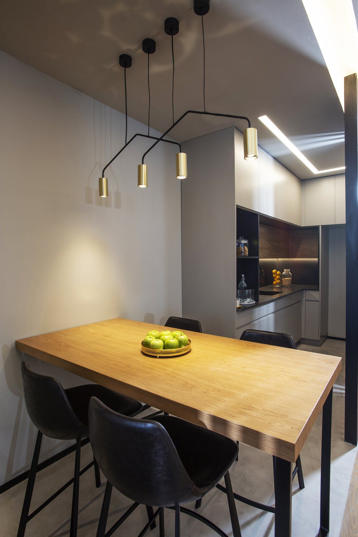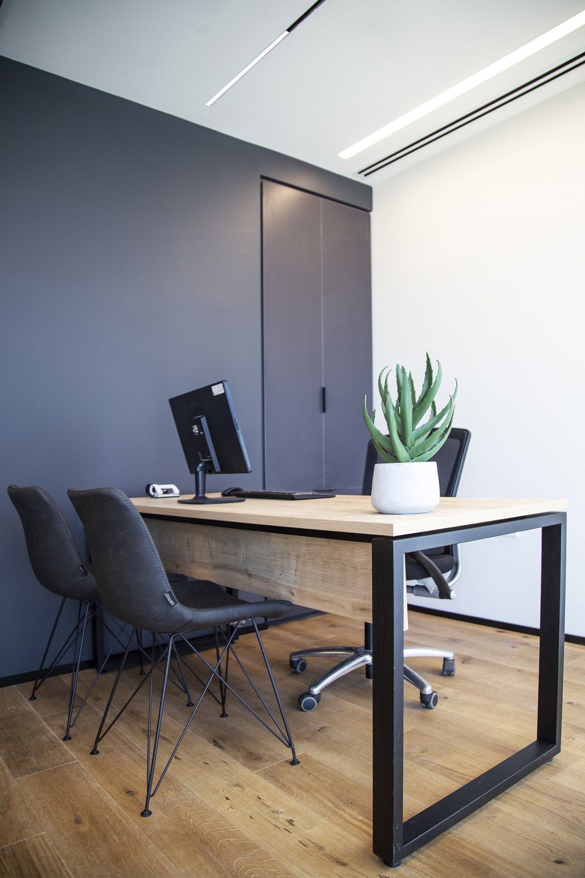בגלל מערכות קיימות וקורות, נדרש מאיתנו להנמיך את התקרה כולה עד לגובה 2.60. מסיבה זו, העדפנו לתכנן בתקרה פסי תאורה שקועים ומינימליסטים, חלק כתאורה כללית וחלק כתאורת עבודה, שמגדירים את התנועה בחלל.