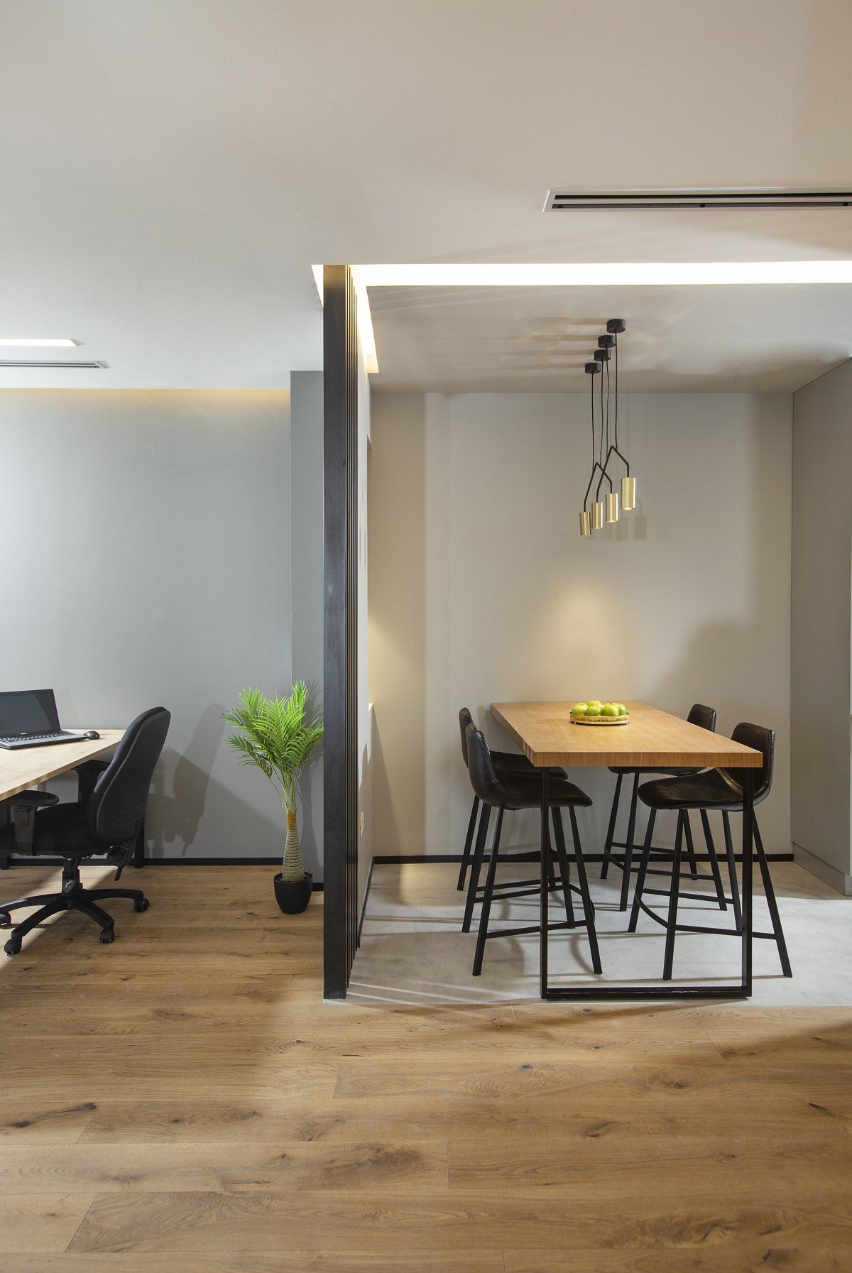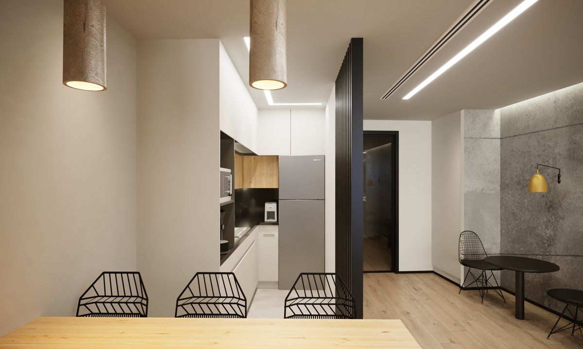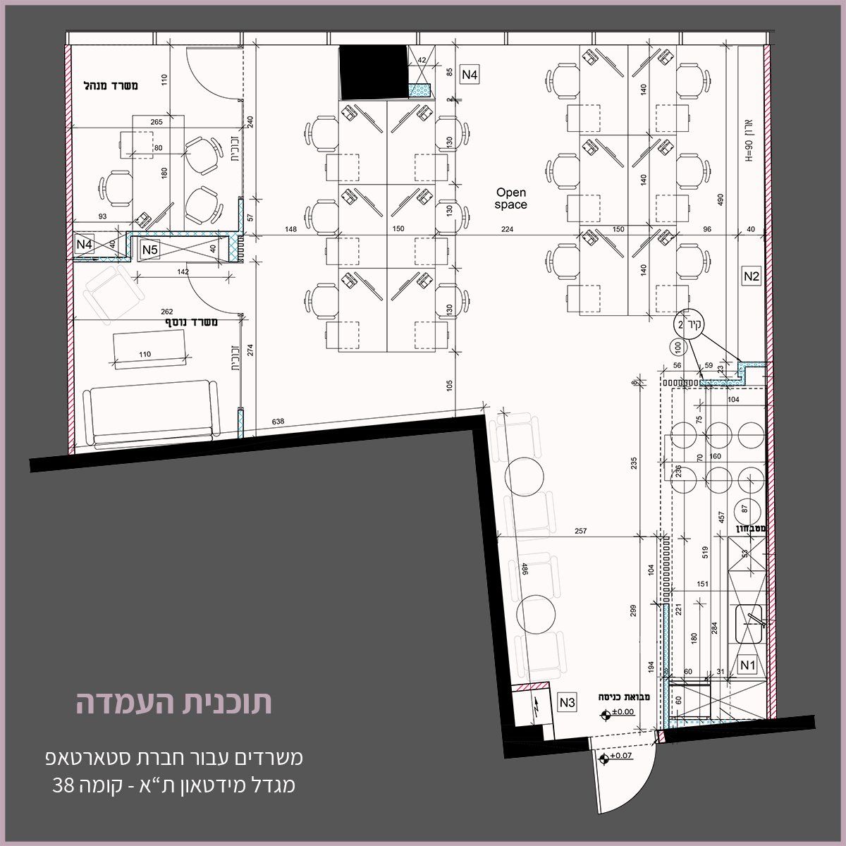 השוכר ביקש שנתכנן חלל Open space עבור 12 עובדים + משרד סגור עבורו ומשרד נוסף סגור שישמש כמשרד משותף לכל העובדים + מטבחון.