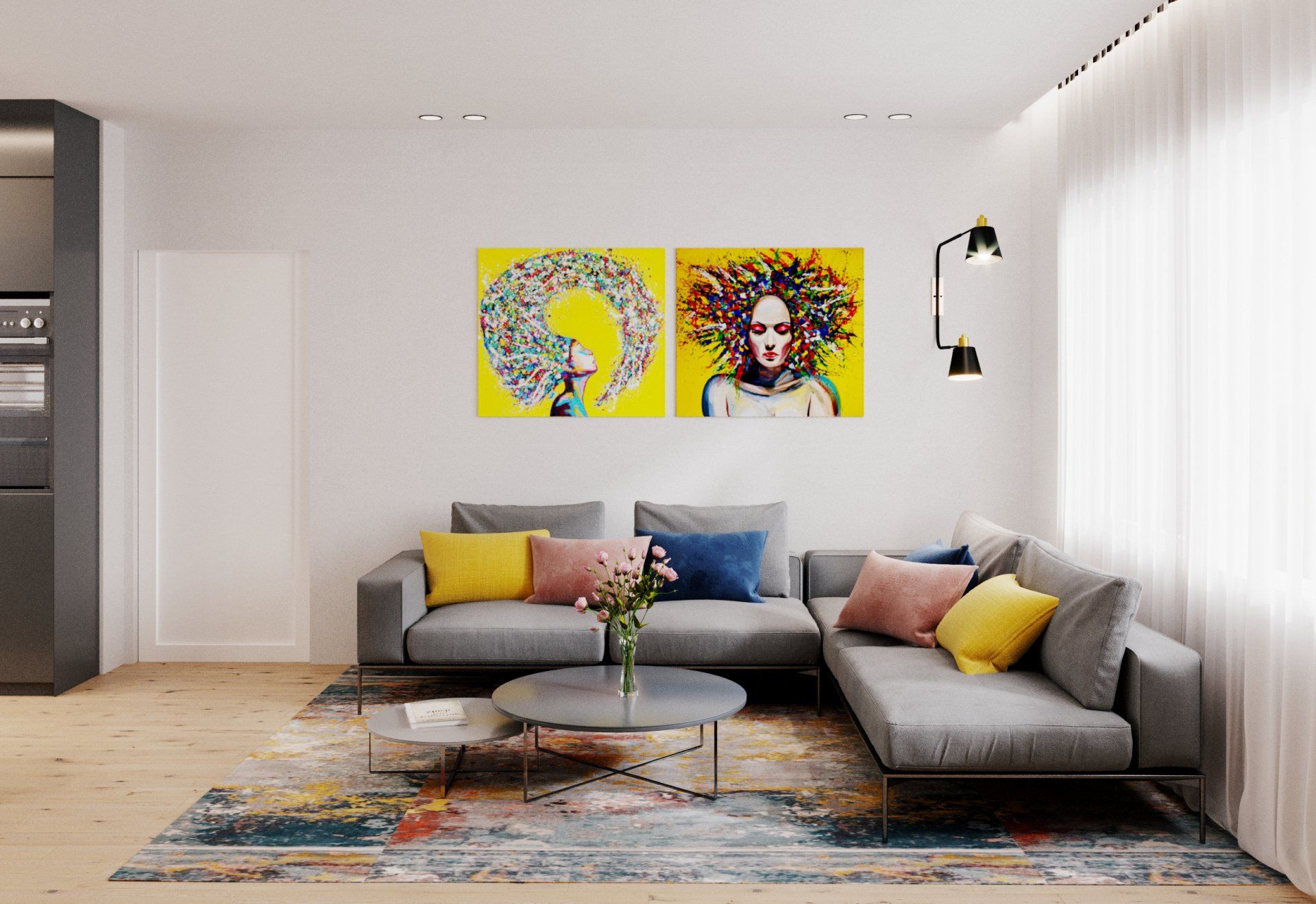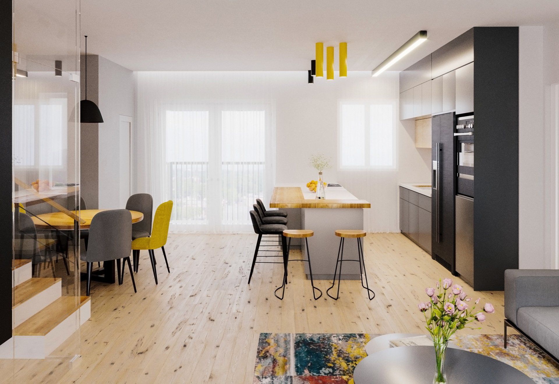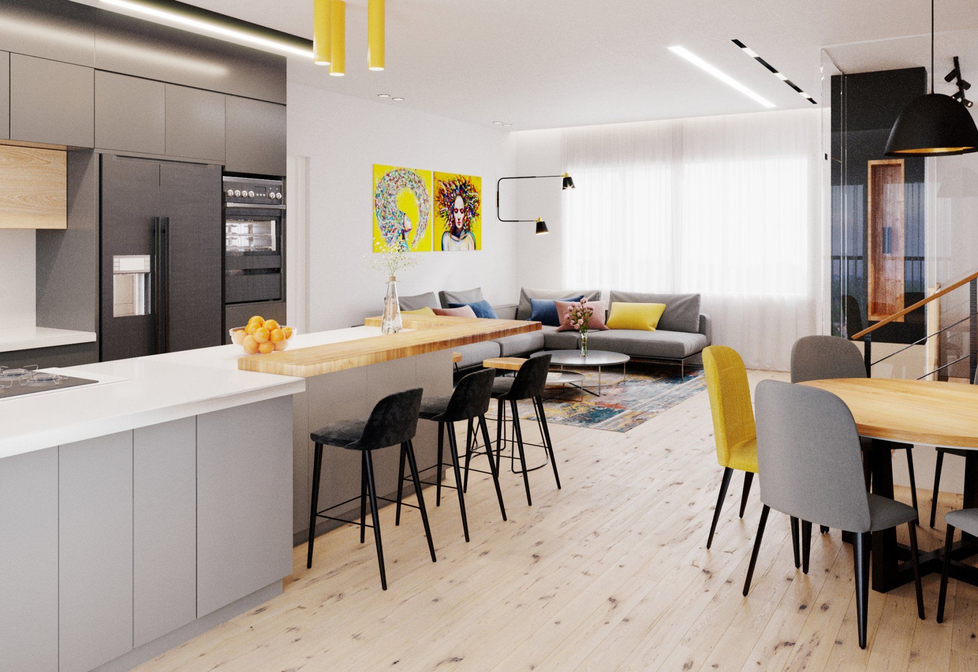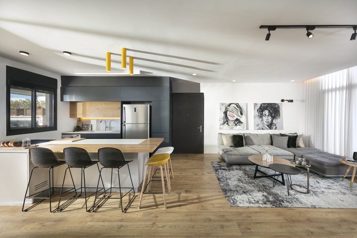 בחרנו להשתמש בפלטה של גוונים מונוכרומטים של שחורים-אפורים-לבנים, עם שילוב של גוון אחד נוסף, הגוון הצהוב, עץ ופרקט שהעניקו לעיצוב את הנגיעות של החמימות שרצינו.