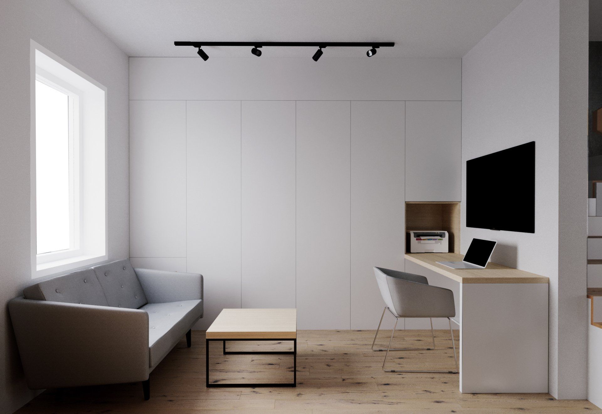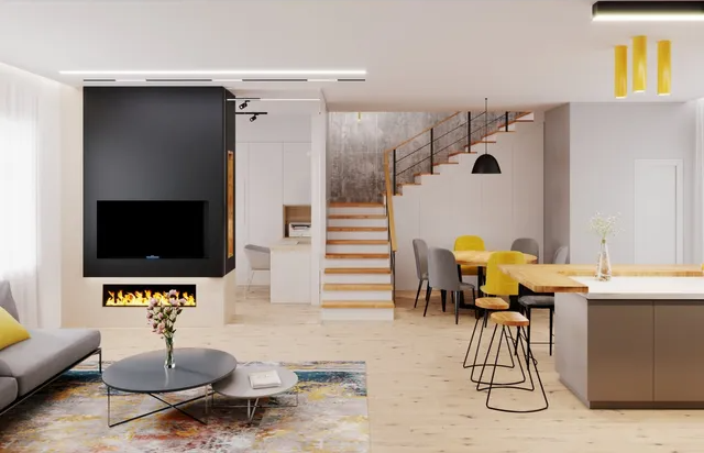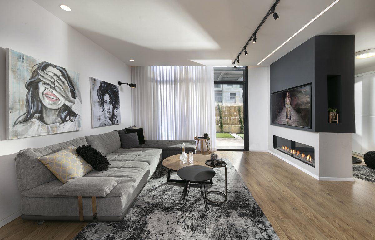 מהסיבה הזו, החלל הציבורי כולו מתוכנן כחלל פתוח, מהחצר הקדמית ועד החצר האחורית. בנוסף, בחרנו לבטל את חדר השינה הנוסף בקומה זו, ולחצוץ אותו עם קיר טלוויזיה הכולל קמין גז יוקרתי, ומאחוריו חלל העבודה והמשחקים, שחלקו נשאר פתוח לחלל הסלון.