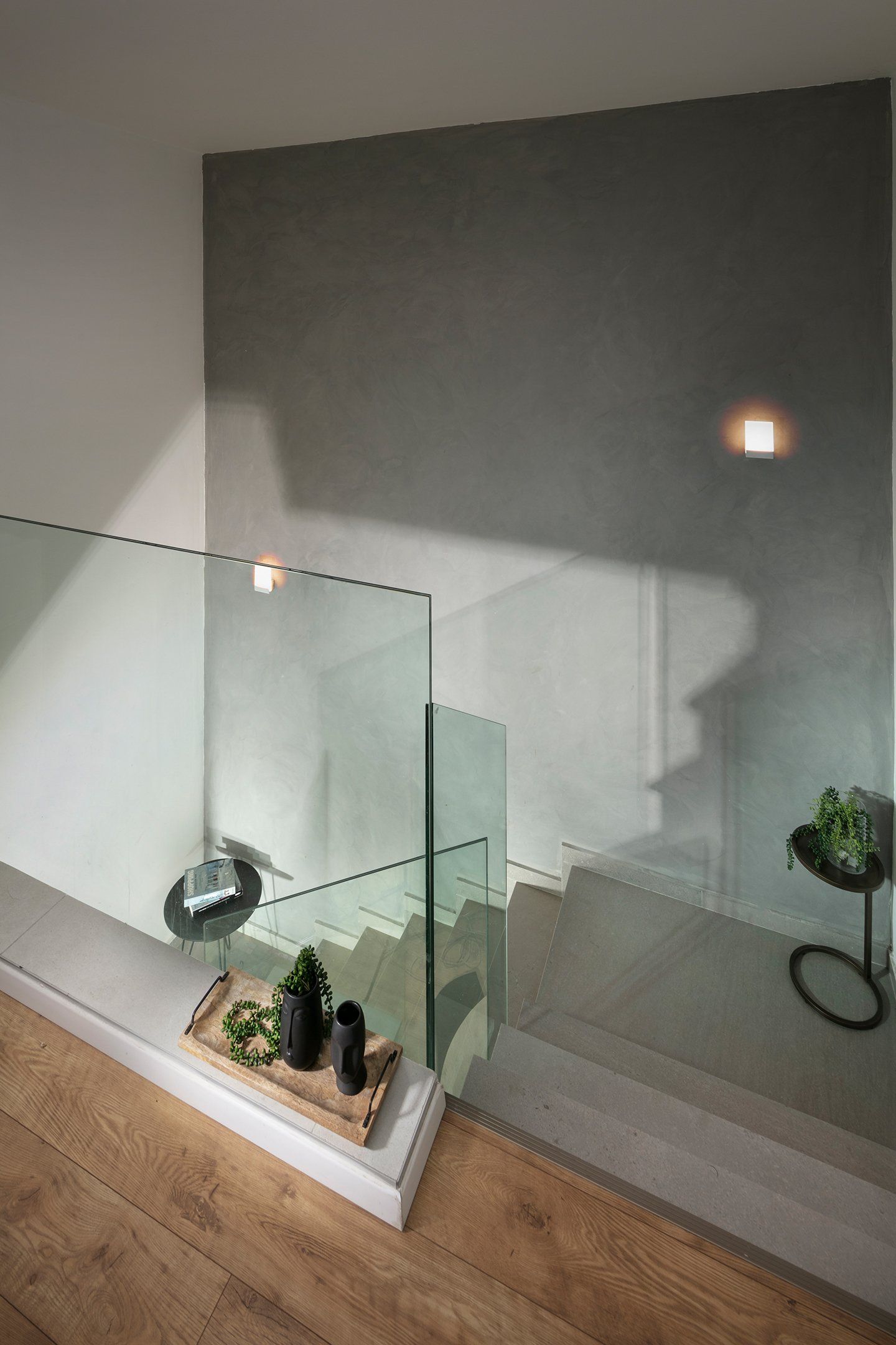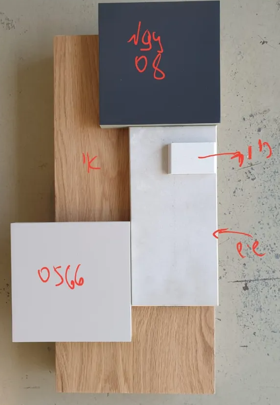 בטון, צבעים אפורים, ומתכת שחורה, גוונים צהובים, ורודים וכחולים יחד עם עץ אלון טבעי.